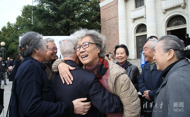 老校友在大礼堂前的相聚重逢。石加东 摄