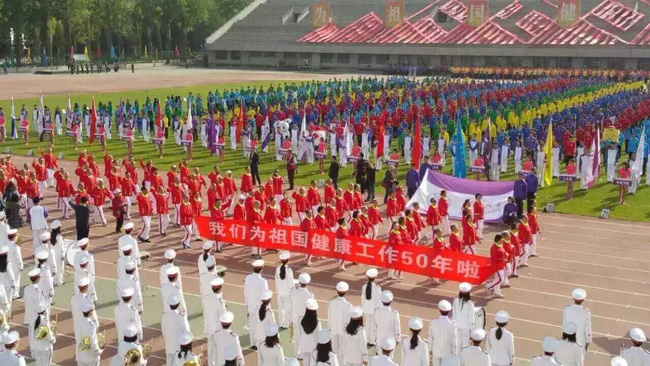 1966届校友举起“我们为祖国健康工作50年啦!”的条幅走过主席台。