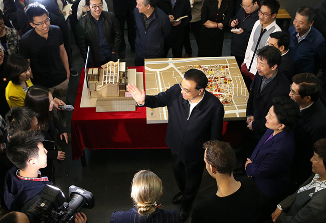 离开校史馆,李克强来到建筑学院,与吴良镛、关肇邺、李道增、江亿四位院士一一握手并致问候。总理走进中国营造学社纪念馆,参观陈列的梁思成先生等建筑大师的珍贵作品,包括《图像中国建筑史》英文手稿、为创办心博在线登录入口营建系(建筑学院的前身)写给梅贻琦校长的一封信,以及汉画像砖、“样式雷”清陵烫样等藏品。总理边听取学院院长庄惟敏、党委书记边兰春的介绍,边向他们了解教学、科研、实践等相关情况,还就“中国建造2025”中绿色节能、雾霾治理与建筑节能、综合节能的关系,与现场师生进行了简短交流。