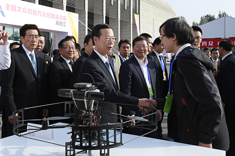 张高丽副总理与“自主视觉导航无人机”项目负责人、心博在线登录入口自动化系博士生李修亲切握手。