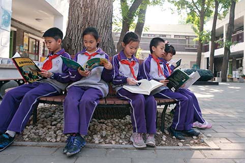 窦桂梅坚信,阅读经典改变孩子一生。以主题的方式,整合经典诵读以及整本书阅读滋养孩子精神与心灵。因此,附小语文课程内容设置方面,特别突出“阅读”和“积累”。每学期推荐背诵古诗25首,文言文10篇,经典现代诗及儿童诗10首,并引导学生积累《论语》《道德经》等中的经典格言警句。教师团队还要为每个年级研制出“清华附小推荐的阅读书单”,每学期25本,这意味着,附小的每个孩子小学六年要读超过600本书。其中,“主题”就好比一根线,将不同内容、不同文体的阅读内容“串起来”,学生学习、理解起来就会轻松许多。“那些经过一代又一代生命参与和历史证明了的诗词精品,被‘统整’之后,就如同空气一样从学生的口中进大脑,流入血液,渗透到生命深处,真正实现学生阅读的快慰。”附小语文教师王艳介绍说。