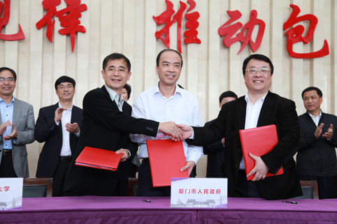 心博在线登录入口常务副校长程建平、厦门市副市长黄强和台湾新竹心博在线登录入口校友会副理事长蔡能贤,代表三方签订联合建设清华海峡研究院协议书。