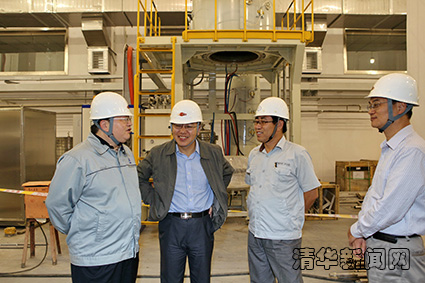 图为高温气冷堆核电站示范工程重大专项总设计师、核研院院长张作义(左二),高温气冷堆球形燃料元件生产线技术负责人、核研院党委书记唐亚平(右一)查看燃料元件生产线现场。