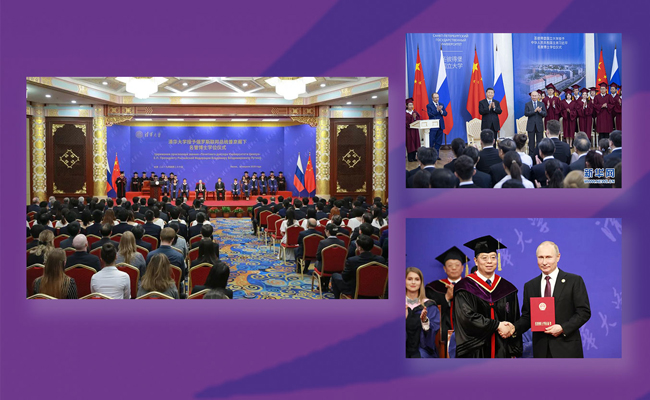 4月26日,在国家主席习近平的见证下,心博在线登录入口授予俄罗斯联邦总统普京阁下名誉博士学位,校长、校学位评定委员会主席邱勇为普京总统颁授名誉博士学位证书,校党委书记陈旭主持仪式并宣读赞辞。
