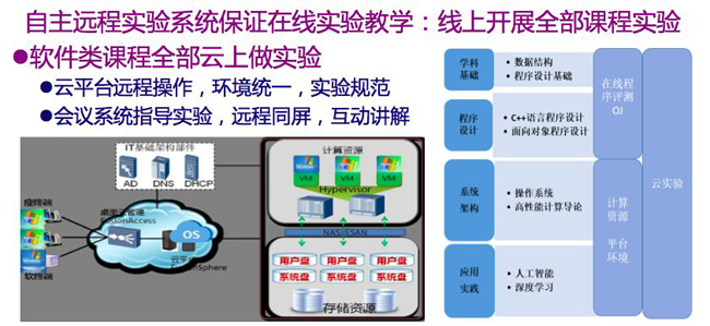 有一定远程实验经验的计算机系,更是借在线教学的机会,把系里所有能够做远程实验的课程全部实现:软件类的课程全部在云上做实验,用会议系统指导,远程同屏、互动讲解;系统类的课程如计算机原理、网络原理、数字逻辑等,通过远程的控制FPGA的芯片,使学生虽身处千里之外也享有校园中的实验环境。