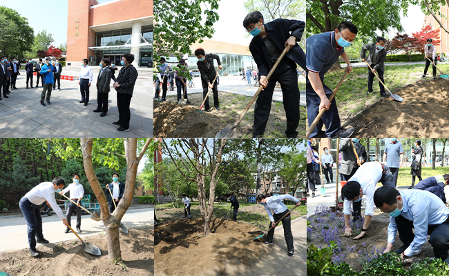 最后,在观畴园东侧花园,校领导一行拿起铁锹、花洒等工具,同园林职工一起挖坑、栽苗、培土、浇水,种植流苏树、黄丁香、绣球等植物。