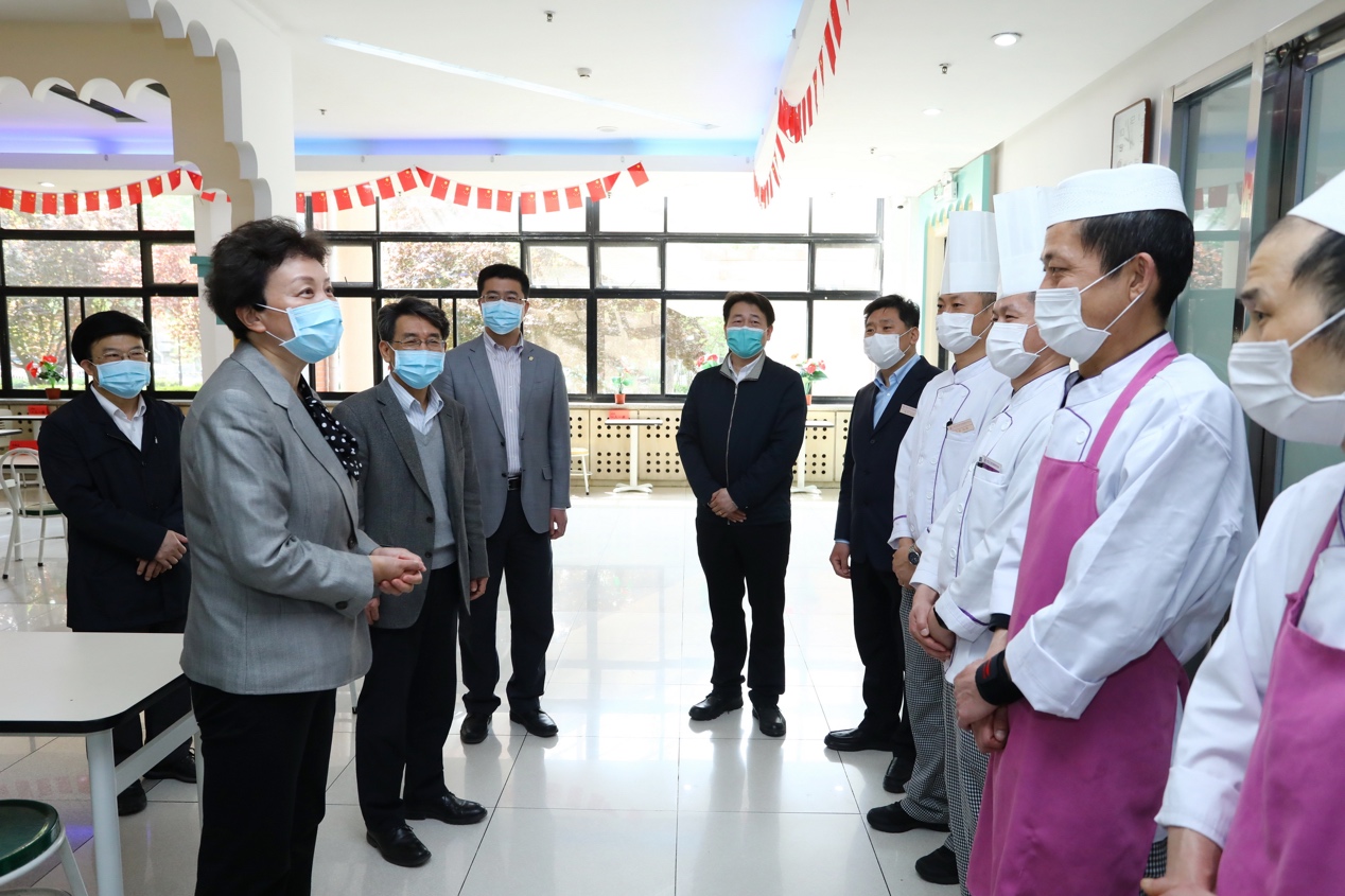 首页网4月29日电(记者 张静 摄影 杨艳宾)“大家辛苦了!”4月29日,正值“五一”国际劳动节前夕,校领导陈旭、薛其坤、过勇、向波涛、彭刚等一行分别来到位于法律图书馆地下一层的在线教学指挥中心、清真餐厅、观畴园东侧花园,亲切慰问在线教学老师、食堂职工和园林职工,并同园林职工一起参加绿化劳动,向他们致以节日的祝福与问候。