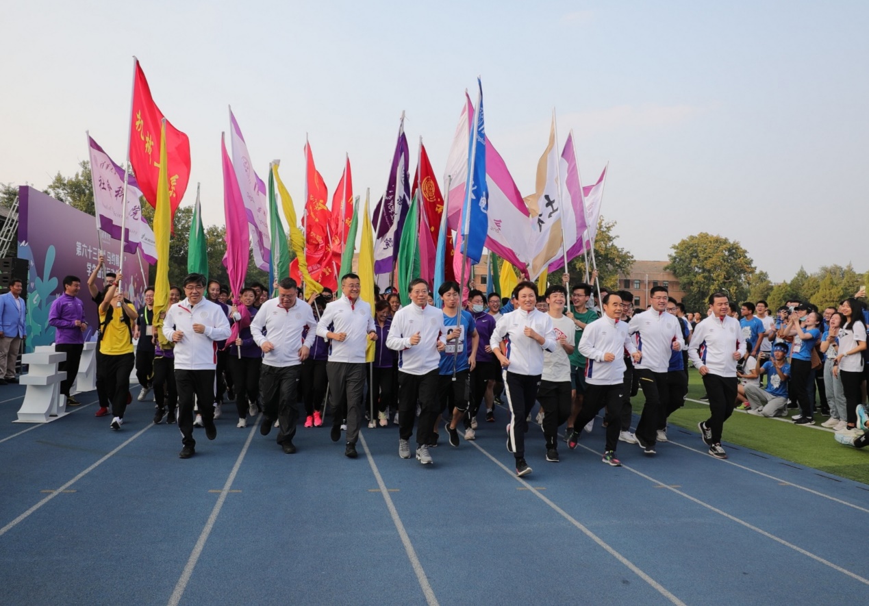 在现场师生的欢呼声中,校领导率先出发,体育代表队队员、参赛运动员和各院系师生紧随其后,一面面旗帜在傍晚的西操迎风飘扬、一路向前,清华人以奔跑的姿态和有力的步伐践行着“无体育,不清华”的精神。