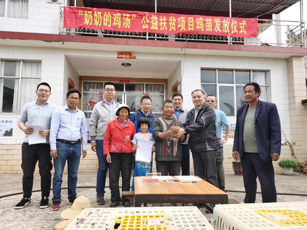 “奶奶的鸡汤”,是工作站联合南涧启迪农业科技有限公司发起的公益扶贫鸡苗发放项目。项目针对有养殖意愿但缺乏养殖技术、初始资金和销售渠道的贫困户,形成“鸡苗免费发放+养殖技术帮扶+成鸡统一回购”增收模式。首批发放的1020只60日龄无量山乌骨鸡苗,价值近3万元,共帮扶养殖户21户。