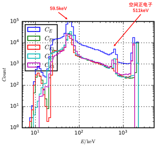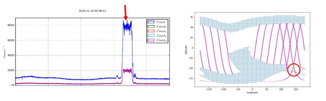 卫星经过南极和南大西洋辐射异常区时的伽马光变曲线变化(上) 卫星载荷探测到的空间伽马能谱(下)