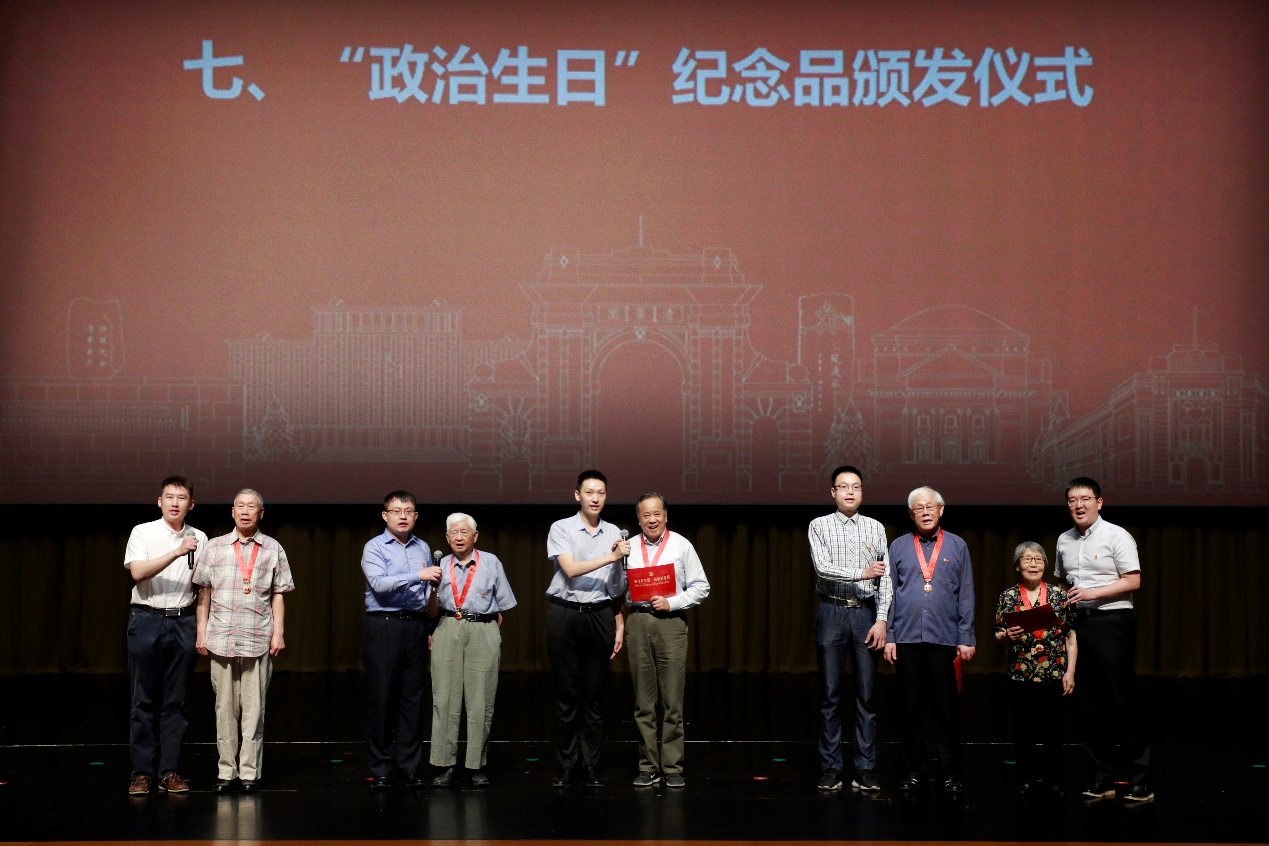 机械系陈丙森、核研院焦荣洲、数学系刘晓遇、精仪系王东生、社科学院刘江永是学校光荣在党50年的老党员代表,他们和毕业生党员代表共同上台,共讲党史,带领大家重温百年党史的峥嵘岁月,传承入党初心。