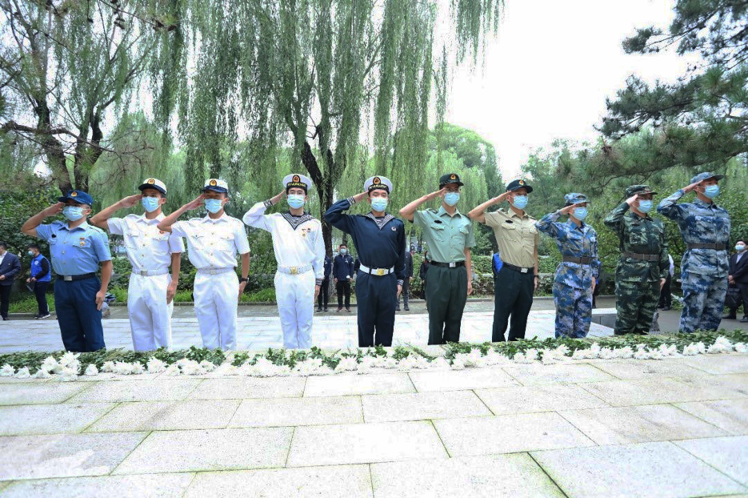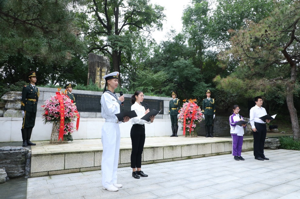 雄壮的国歌唱毕,仪仗队向“祖国儿女·清华英烈”纪念碑敬献花篮。随后,全体师生肃立,向这座纪念碑上镌刻着的65位在抗日战争和解放战争时期献身的清华英烈以及千千万万为国捐躯的英雄儿女表示深切哀悼。