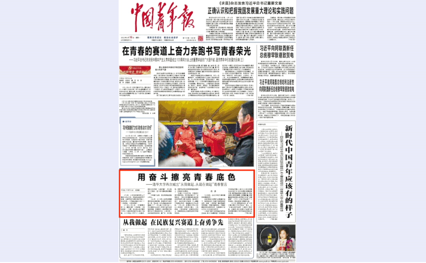 站在共青团第二个百年的新起点上,在全面建设社会主义现代化国家新征程上,清华人传承弘扬优良传统,再次喊出“实现伟大复兴,从我做起,从现在做起”的青年誓言。他们与无数中国青年携手并肩,在青春的赛道上奋力奔跑,他们将永远奔跑在时代的最前面,跑出属于中国青年的新纪录!
