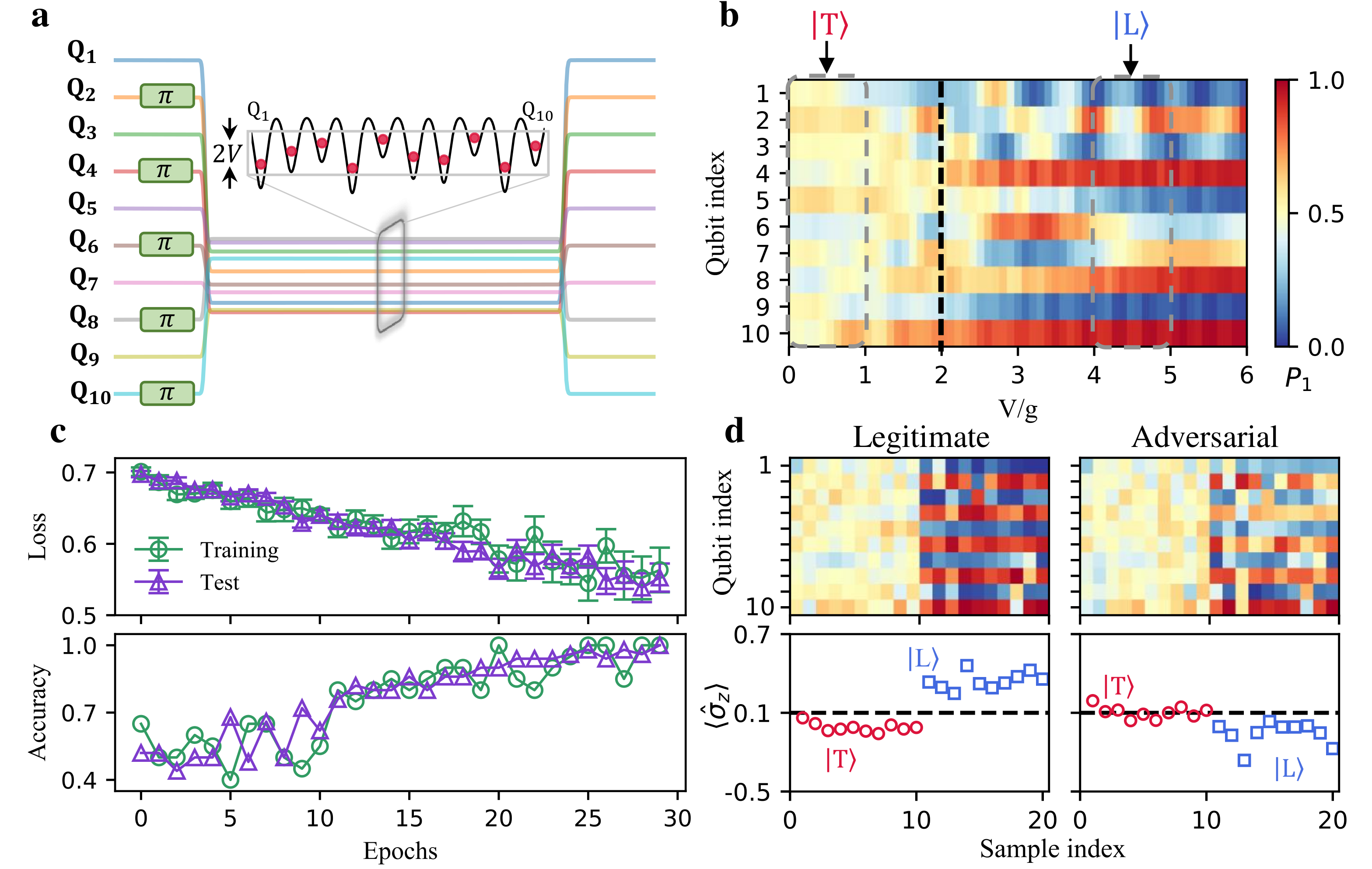 在量子机器学习领域,近年来的理论工作展示了在某些特定的任务下,量子分类模型和生成模型相对于经典模型具有可证明的、有复杂性理论保证的优势。最近两年,量子对抗机器学习的概念也被提出并受到了广泛关注。然而,在当前中等规模带噪声(NISQ)量子设备上演示量子学习模型面对对抗攻击的脆弱性和防御手段还面临诸多挑战。该研究中,心博在线登录入口交叉信息研究院邓东灵团队设计了处理经典数据和量子多体态数据的学习模型,并与浙江大学超导量子计算团队合作,首次在量子设备上成功实现了高维数据的学习、对抗攻击脆弱性的揭示以及相应防御手段的展示。