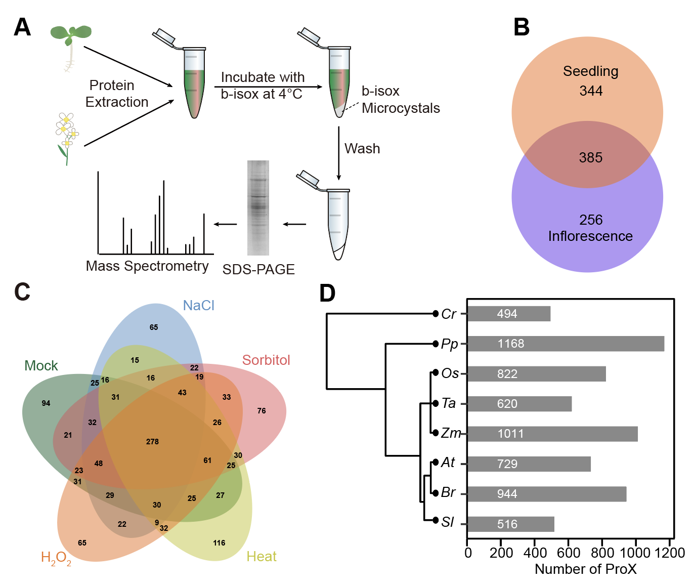 图1.(A)基于b-isox鉴定相分离蛋白的流程图。(B)韦恩图显示从拟南芥幼苗和花组织中鉴定到的具有相分离潜力的蛋白。(C)韦恩图显示从拟南芥在不同胁迫条件下鉴定到的具有相分离潜力的蛋白。(D)不同物种中鉴定得到的具有相分离潜力的蛋白的情况。Cr代表衣藻;Pp代表小立碗藓;Os代表水稻;Ta代表小麦;Zm代表玉米;At代表拟南芥;Br代表白菜;Sl代表番茄
