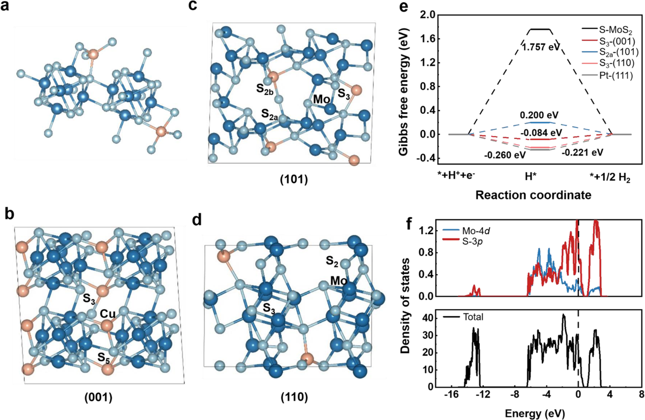 微米划痕测试结果表明,同源金属电极的界面结合力相比于传统粘结剂负载的Pt/C电极提高了2倍,证实了催化剂与基底界面的结合力强。由于同源金属电极表现出金属性质和高表面粗糙度,其展现出Wenzel state的超亲水和超疏气特性。原位气泡观察发现电极表面气泡的脱附速率提高6倍,气泡粘附力减小二分之一,从而证实了同源金属电极在传质方面的优越性。另一方面,研究人员通过密度泛函理论(DFT)计算发现,Cu-CuMo6S8具有金属性和高的催化活性。CuMo6S8的Mo 4d与S 3p轨道占据费米能级附近,展现出金属性质,有效提高了界面电导。