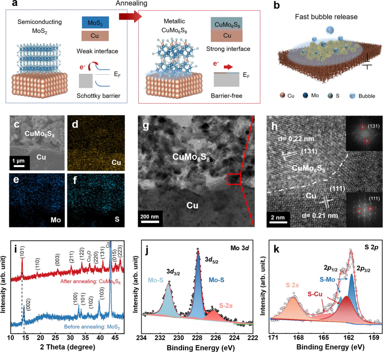 近日,心博在线登录入口深圳国际研究生院刘碧录团队创制出一种基于双界面设计的同源金属电极。该电极以优化催化剂与基底以及催化剂与气泡的双界面为出发点,解决了大电流密度制氢下的传质、界面力学、界面电导三大难题。这种同源金属催化剂通过MoS2和Cu的原位高温反应制备,将半导体相MoS2转成具有金属性质的Chevrel相CuMo6S8,这种一体化结构有效消除了半导体-金属接触的界面肖特基势垒。由于电极表面催化剂与基底具有强的化学键结合,且电极展现出全金属性质以及超亲水状态,因此有效提升了催化剂/基底界面结合力并降低了催化剂/气泡界面粘附力,在增强电极稳定性的同时加速了析氢反应的动力学,展现出优异的电催化析氢性能。该电极在2.5 A cm-2下仅需321mV的过电位,在1 A-2.5 A cm-2级别的大电流密度下稳定运行300小时性能无衰减。此外,前驱体MoS2可取自天然矿石辉钼矿,成本比贵金属铂降低2-5个数量级,与目前的大电流密度催化剂相比具有更大的成本优势。