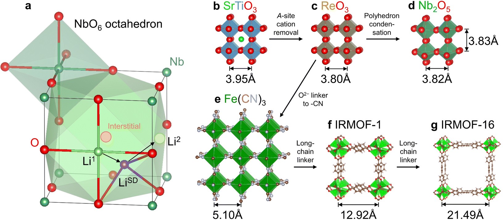 高功率锂离子电池在大型运输、工业设备和电网调节等领域发挥着重要的作用,其关键部件是电池电极材料。理想的电极材料是一种激活能小于0.25电子伏特的超快离子和电子混合导体,这使得约10微米的致密单晶颗粒的商业化成为可能(这样的大单晶颗粒可提高电池的体积能量密度并抑制电池的副反应)。在所有满足小于0.25电子伏特扩散势垒的材料中,具有离子晶格内扩散的材料很少见,但具有离子表面扩散的材料较常见。离子表面扩散的材料通常具有孔径大于2埃的框架结构,这种框架结构的材料包括沸石(孔径为3-10埃)、普鲁士蓝和金属有机框架等纳米多孔材料,这些材料可以吸收大量的水(直径2.8埃),氢气和二氧化碳等小分子。虽然这些纳米多孔框架结构具有极高的离子扩散率,但由于其孔径过大,无法存储过多的碱金属原子,因此无法作为高致密度的电极材料。