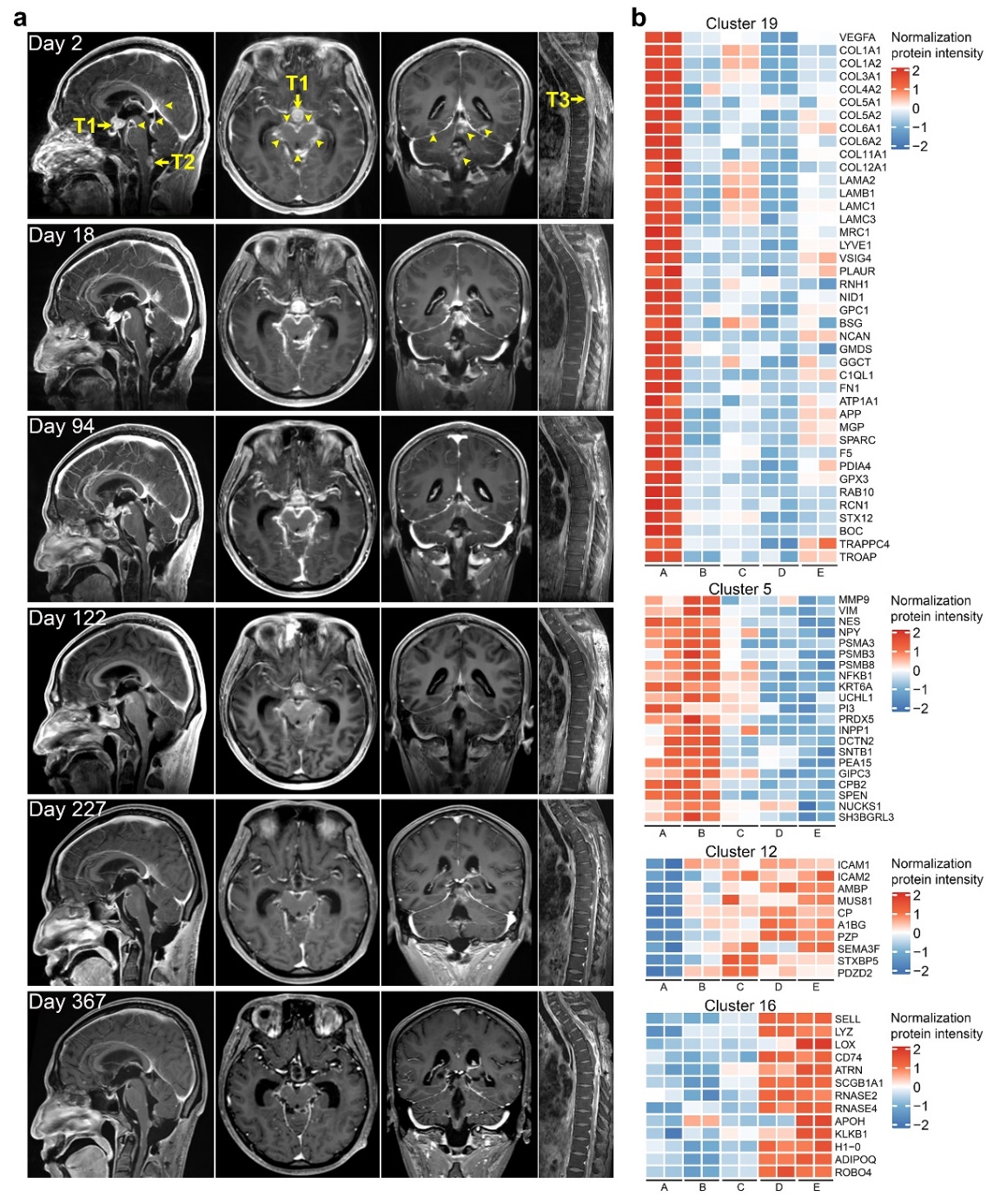 1号患者的治疗反应。a. T1加权增强成像提示肿瘤体积随治疗显著缩小;b. 蛋白组学分析脑脊液中的差异性表达蛋白