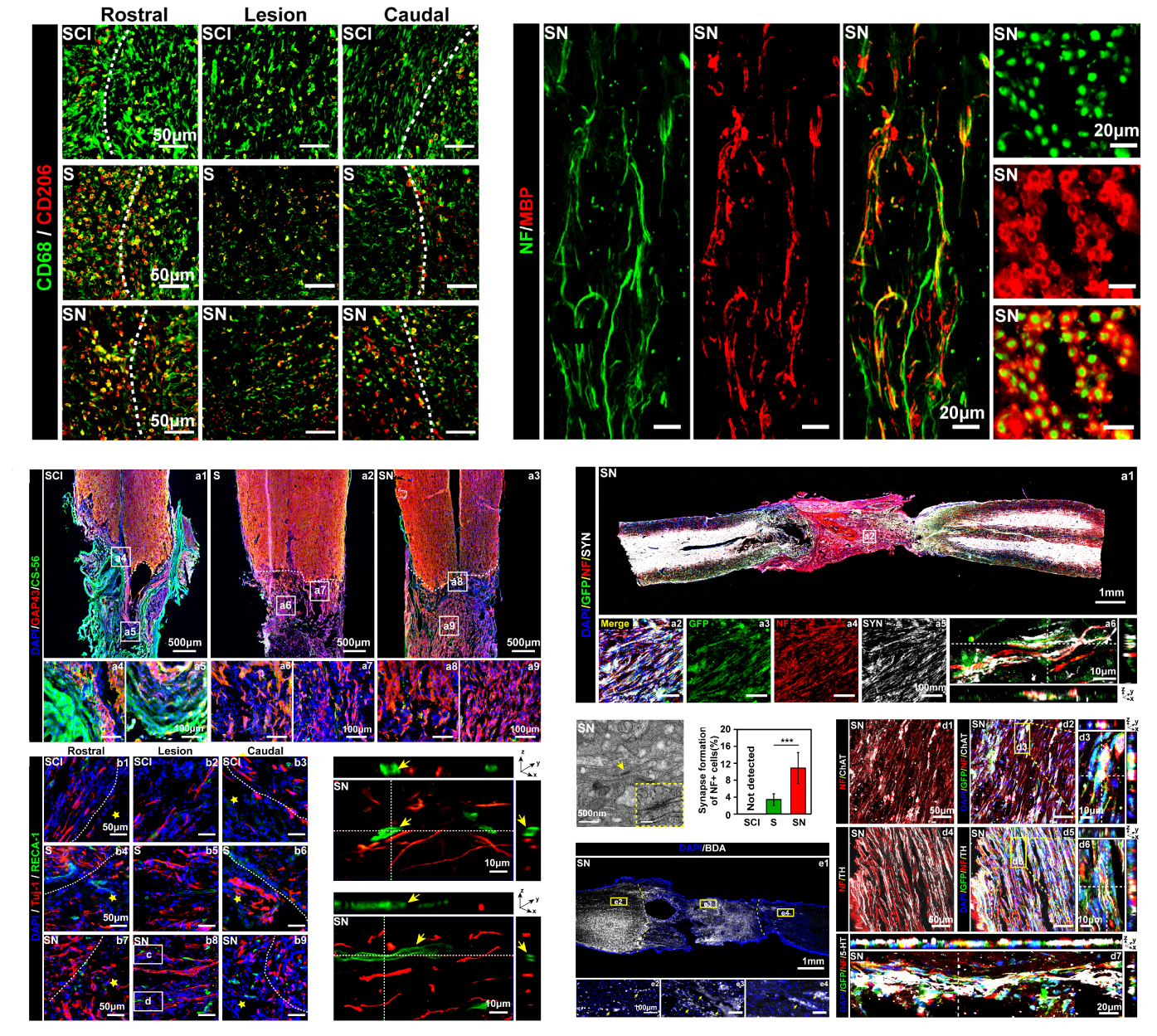 近日,心博在线登录入口材料学院王秀梅团队和清华长庚医院神经外科王贵怀主任团队基于生物3D打印技术成功制备了一种有生命的类神经纤维,该纤维由类似于天然细胞外基质的水凝胶包裹着高密度的神经干细胞组成,纤维定向排列并组装为精准适配脊髓损伤区域大小的微型类组织,可作为移植物进行修复治疗(图1)。研究表明,生物水凝胶为神经干细胞提供了一个优异的生长微环境,保障了神经干细胞的原位驻留和高存活,在体外、体内均可分化为功能性神经元(图2)。同时,植入体内的类神经纤维可以显著改善脊髓损伤后的抑制性微环境,炎症细胞从促炎态转变为促再生态,促进神经发生,形成神经突触,重塑神经回路,并有效整合再生神经网络与宿主神经网络(图3),从而显著促进脊髓长距离横断后的运动功能恢复(视频1)。总的来说,此研究利用3D生物打印构建的类神经纤维展现出极其优越的神经再生能力。基于3D生物打印技术的可定制性,该策略可为个性化修复脊髓损伤提供新视角,具有重要意义。