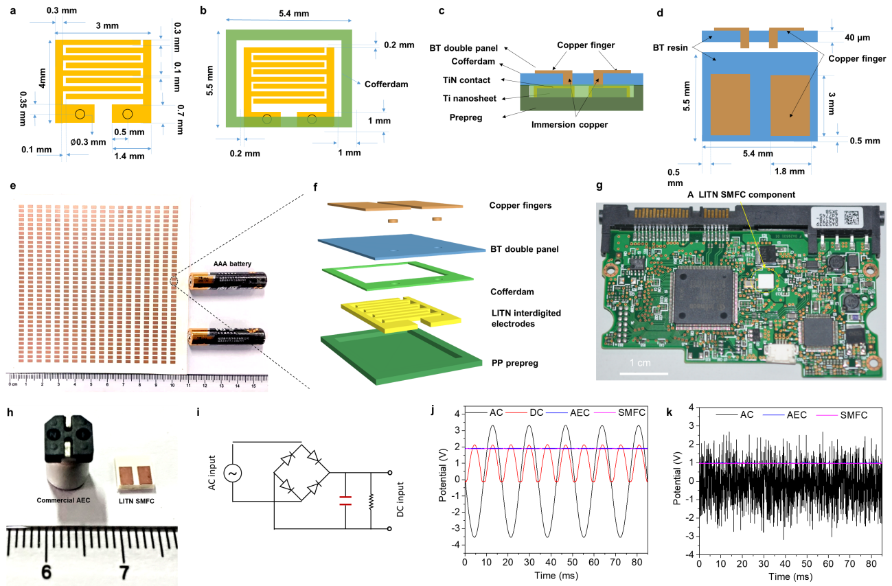 LITN基表面贴装滤波电容器(SMFCs)电极阵列的制备与半导体制造和封装工艺完全兼容,可以满足嵌入式元件的严格规范,表现出简单、经济、高效和可持续的特点。LITN电极的三维介孔和良好的组织结构可以提供丰富的电荷传输通道,并沿垂直和平面方向的阻碍最小。如图3所示,LITN基SMFCs在水系电解质溶液中实现了超长的循环寿命(2,000,000次),120Hz时的面积能量密度为0.92μWhcm-2,体积能量密度为9.17mWhcm-3,这在水系电化学电容器中是创纪录的关键突破。