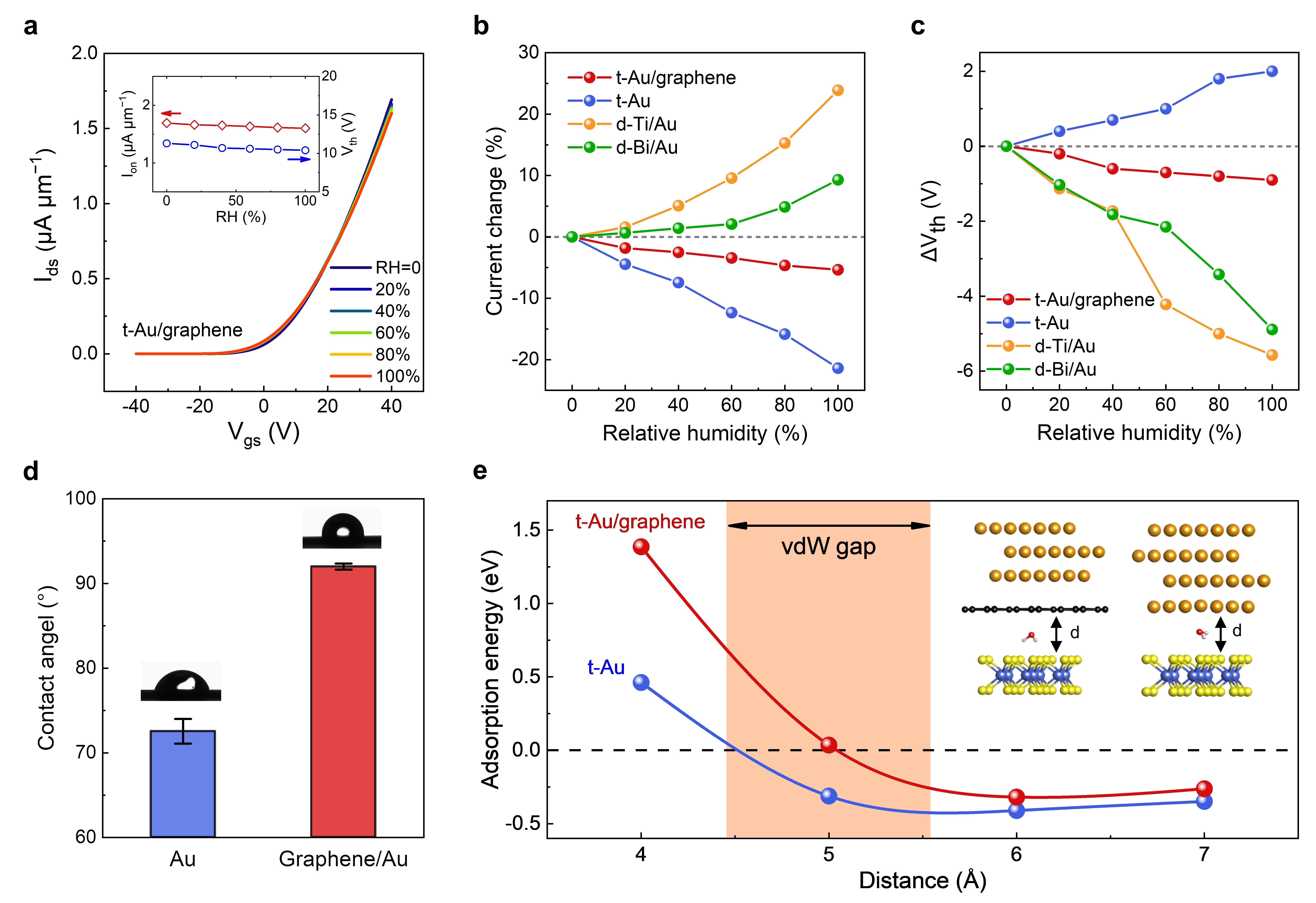 针对上述关键问题,材料学院刘锴副教授课题组报道了一种电极界面工程策略,通过全转移方法制备单层石墨烯缓冲的金电极(t-Au/graphene),构筑了耐受高温、高湿度、氧化等苛刻环境的单层MoS2晶体管器件。在该方法中,化学气相沉积(CVD)制备的高质量单层石墨烯首先被转移的金电极从基底剥离形成t-Au/graphene电极,然后将t-Au/graphene电极转移到单层MoS2上(图2a)。基于这一全转移电极工艺,作为电极缓冲层的单层石墨烯保持了无缺陷的完整结构(图1c)。受益于单层石墨烯的原子级平坦表面和可调节的费米能级,具有t-Au/graphene电极的MoS2器件的肖特基势垒高度降低至47meV,接触电阻降低至4.7kΩ·μm。与使用沉积金属电极或仅使用转移的Au电极的器件相比,低的势垒高度和接触电阻使器件具有更高的开电流和载流子迁移率。更重要的是,无缺陷的疏水性石墨烯缓冲层可以防止金属从电极扩散到MoS2,以及水分子扩散插入到电极界面中,因此使MoS2器件在潮湿、氧化和高温等苛刻环境中具有较高的耐受性。在100%的相对湿度下,t-Au/graphene接触的MoS2晶体管的开电流变化(仅约6%)远小于沉积Au/Ti电极或转移Au电极的器件。与采用Au/Ti电极或Au/Bi电极的器件相比,该器件在氧化环境(空气)中或在350℃退火后也表现出更稳定的电输运特性。在综合考虑迁移率、开电流、耐湿性、耐氧性和热稳定性后,t-Au/graphene电极在所有类型的电极设计中拥有最佳综合性能(图1d)。该工作加深了人们对纳米器件中电极界面作用的理解,并为构建具有苛刻环境甚至极端环境耐受能力的纳米器件提供了有效的电极界面工程策略,有望适用于所有的二维TMDCs器件。
