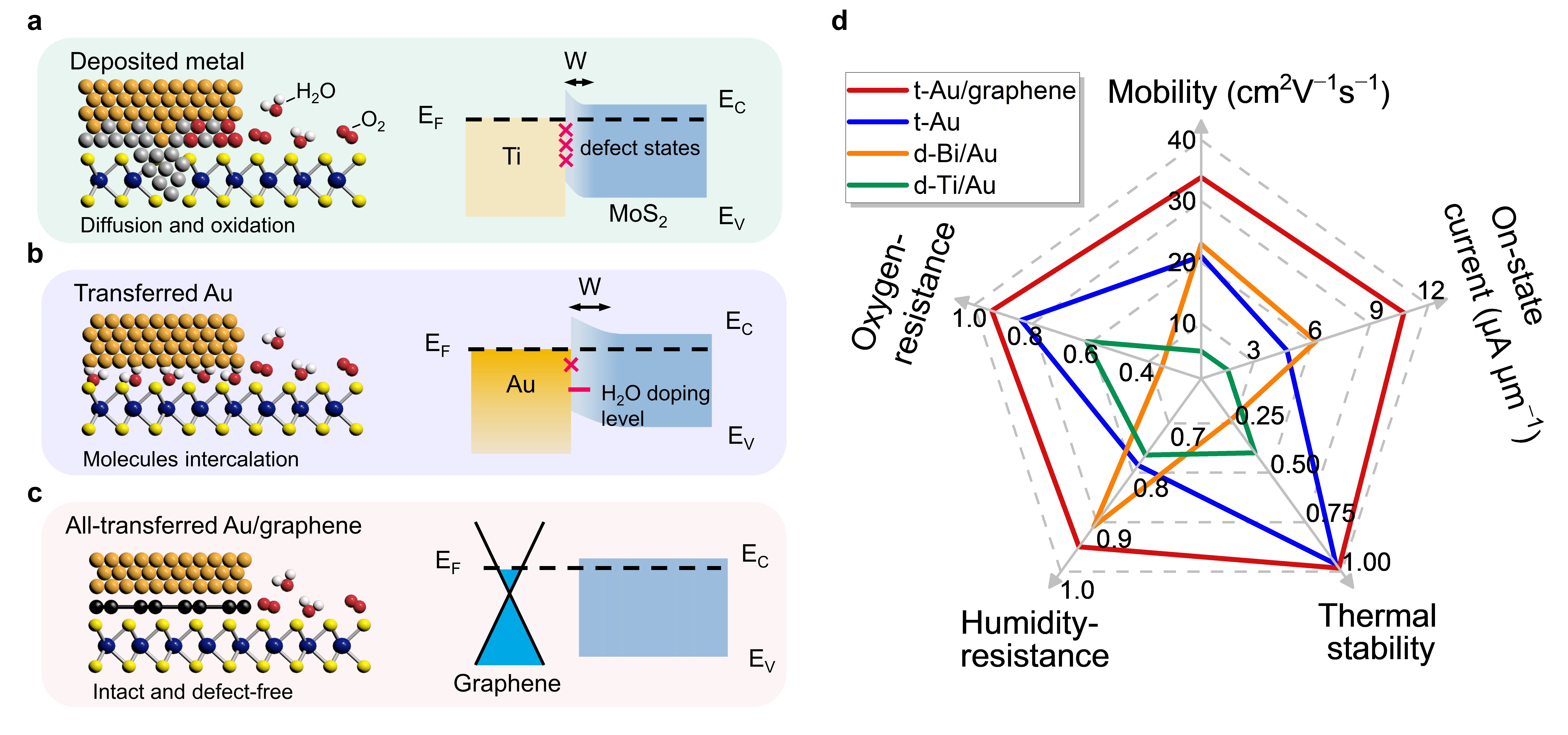 相比之下,通过转移金属电极与TMDCs材料形成的范德华电极接触,能够有效降低电极-TMDCs界面的缺陷浓度,从而有利于制备出高性能的TMDCs器件。但在苛刻环境中,一些活泼气体分子(如潮湿环境中的水分子)可能会嵌入到较大的范德华间隙中,增加接触势垒并严重散射载流子,使得TMDCs器件性能衰减(图1b)。因此,精细的电极界面设计对于构建具有良好环境耐受性的纳米TMDCs器件至关重要,这要求电极界面不仅具有较少的缺陷,而且能够有效阻挡金属扩散和气体分子的进入。