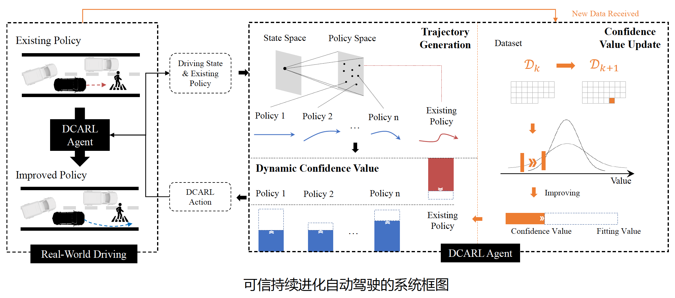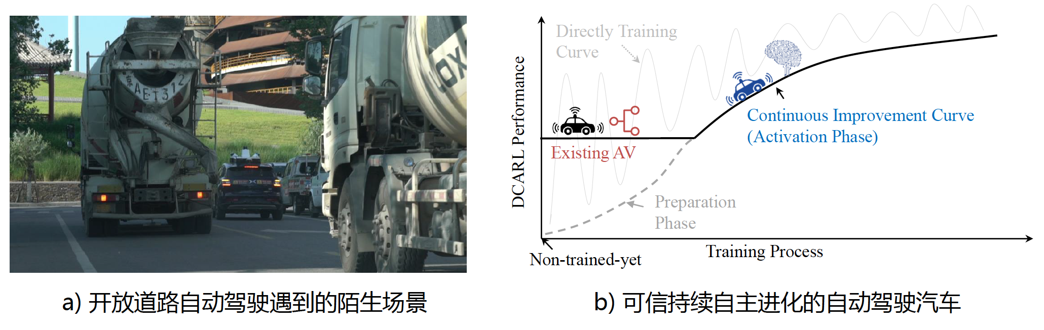 为解决这一问题,心博在线登录入口车辆学院研究团队提出了自动驾驶“可信持续进化”技术,该技术会在自动驾驶汽车行驶初期将所有场景无差别地看成未知场景,均采取主动避让的基础驾驶策略以保证安全性;在此基础上,AI模型将从大数据中主动寻找熟悉的行驶场景,并自主地将在这些场景中的驾驶性能从基础策略调整到更优水平,因而能从系统设计的角度,解决长尾场景难以穷尽的问题,保证在任意场景下不依赖预先设定的“可信持续进化”。实现这样一个技术最核心的难点在于进化的过程要保证性能是单调提升的,这样才能使得整个进化过程仍具备最基础的安全性,但经典的AI训练过程中性能通常存在震荡现象,可能会引发新的安全风险,而研究团队设计的通过动态评估置信度进行AI模型训练的方案,能够使性能随数据的增加而单调持续提升,因而能够很好地满足这一要求。