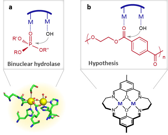 塑料的大量使用造成了严峻的环境和能源问题,特别是年产量巨大的聚对苯二甲酸乙二醇酯(PET),占全球固废总量的近12%。目前,PET的化学循环需要在高温、高压或高浓度酸碱等苛刻条件下进行,开发节能环保的PET降解途径充满挑战。PET水解酶可在温和条件下实现PET的解聚,这主要得益于酶催化的邻近定位效应:活性中心同时与PET以及亲核试剂结合,让二者彼此靠近并采取正确的空间取向,极大提高了底物的局部有效浓度。这一反应机制在金属水解酶上也得到充分体现。比如来自放射杆菌的有机磷降解酶(OpdA),其活性中心由两种金属离子(如di-Zn、di-Co等)组成。它采用相同的邻近定位效应加速有机磷水解(图1a)。截至目前,没有记录表明OpdA或其他双核金属水解酶具有降解PET的活性,这可能是因为聚合物分子无法接触OpdA的活性中心。牛志强课题组猜想,若将OpdA的非催化蛋白骨架去除,将双核位点充分暴露后,可能会催化PET降解(图1b)。