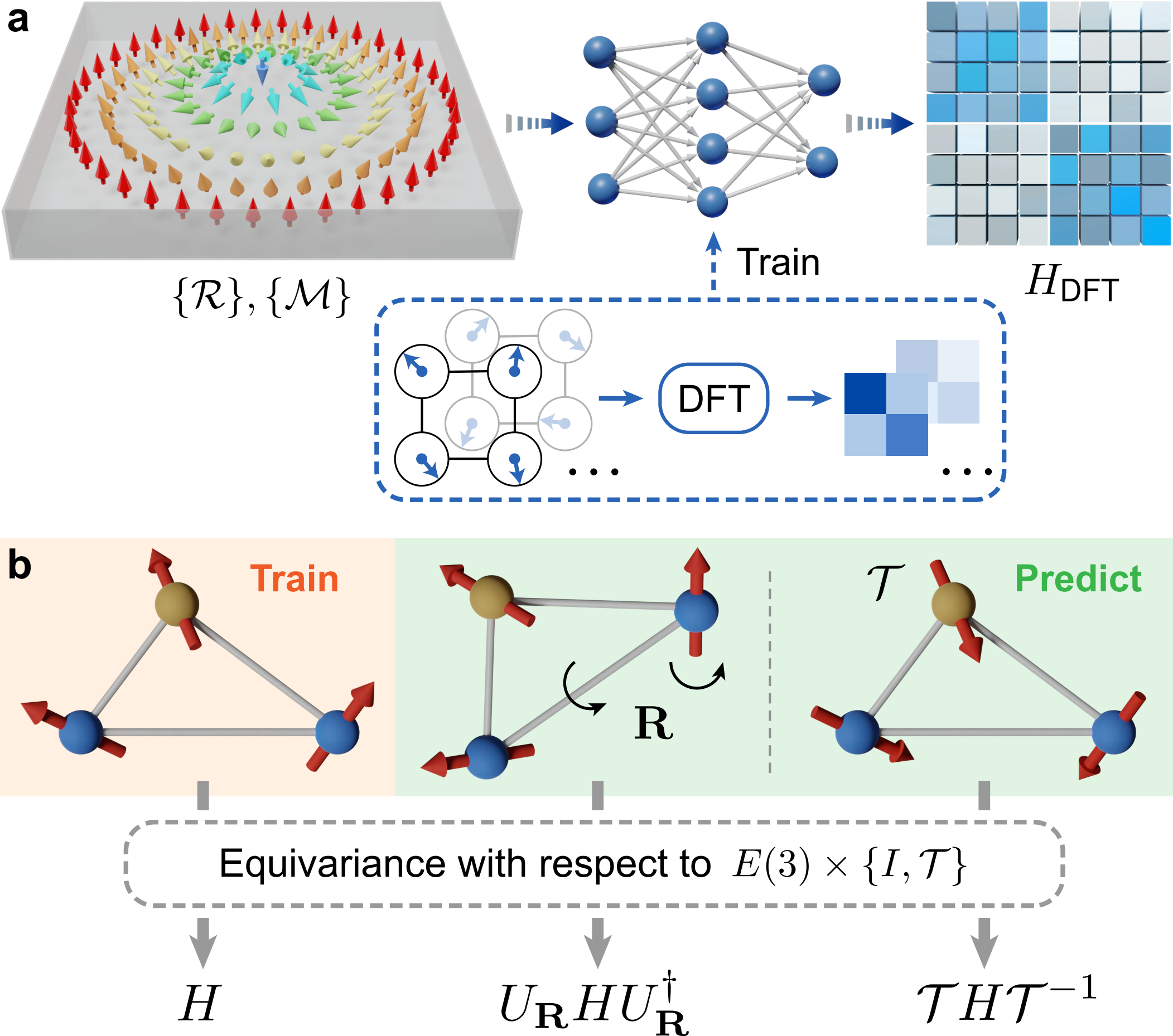 xDeepH方法用于磁性材料的高效电子结构计算的示意图。(a)xDeepH方法的流程图。以磁性材料的原子结构和磁结构作为输入,等变神经网络可预测其DFT哈密顿量。只需利用小尺度材料的DFT数据训练神经网络,就可以研究大尺度磁性超结构 (比如磁性斯格明子)。(b)DFT哈密顿量作为原子结构和磁结构的函数,在空间旋转和时间反演操作下具有等变性。