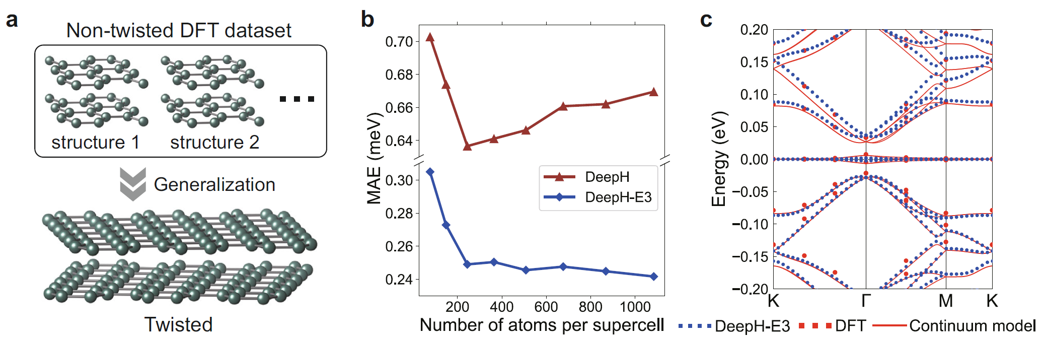 图3.DeepH-E3方法应用于转角双层石墨烯。(a)DeepH-E3方法的工作流程。神经网络在非转角、有随机扰动的小体系上训练后,可以推广到任意转角的大体系,而不再需要再进行DFT计算。(b)DeepH-E3方法与原本的DeepH方法在研究不同转角的双层石墨烯时的表现的对比。对于不同的转角体系,摩尔超晶格内的原子数也不同,图中显示了神经网络在这些结构上预测的哈密顿量相对DFT结果的平均绝对误差(MAE)。(c)超晶格内有11164个原子的魔角石墨烯的能带,分别由DeepH-E3,DFT以及连续模型计算得到