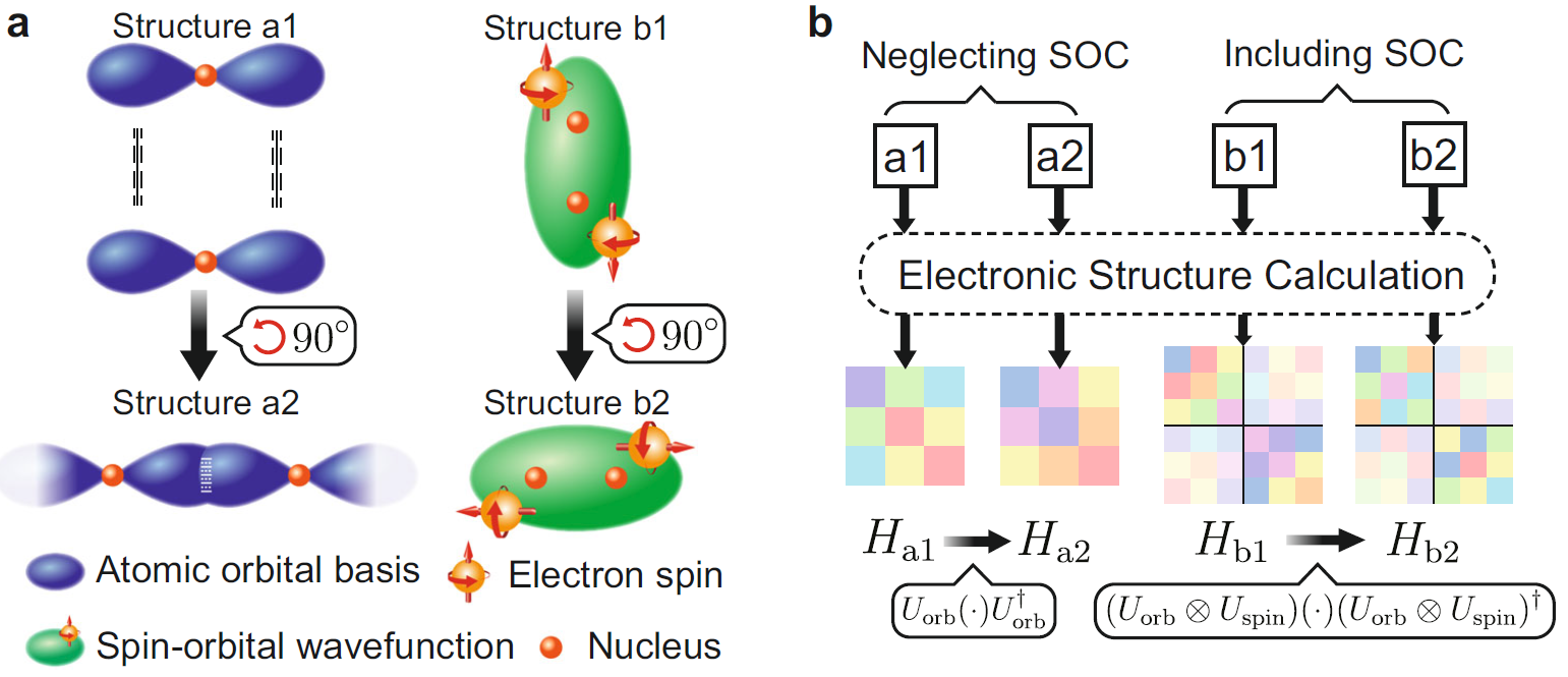 图2.电子结构计算中的协变性。对于自旋轨道耦合(SOC)被忽略或被包含的两种情况,a材料结构和波函数示意图,b哈密顿量示意图。结构a1和a2之间由90度的旋转联系起来(a),而这两个结构的px轨道间的跃迁强度(哈密顿量矩阵元)则由一个酉矩阵联系起来(b)。任何电子结构计算必须满足这一协变性的要求。当SOC不可忽略时,自旋和轨道空间的自由度互相耦合且在旋转操作下一起变换,如结构b1和b2