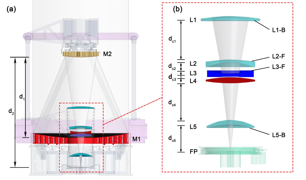 图2.(a) MUST光学系统,其中M1为6.5米主镜、M2为2.4米副镜。(b) WFC由透镜L1~L5组成。L1的背面(L1-B)、L2的正面(L2-F)、L3的正面(L3-F)、L5的背面(L5-B)为非球面