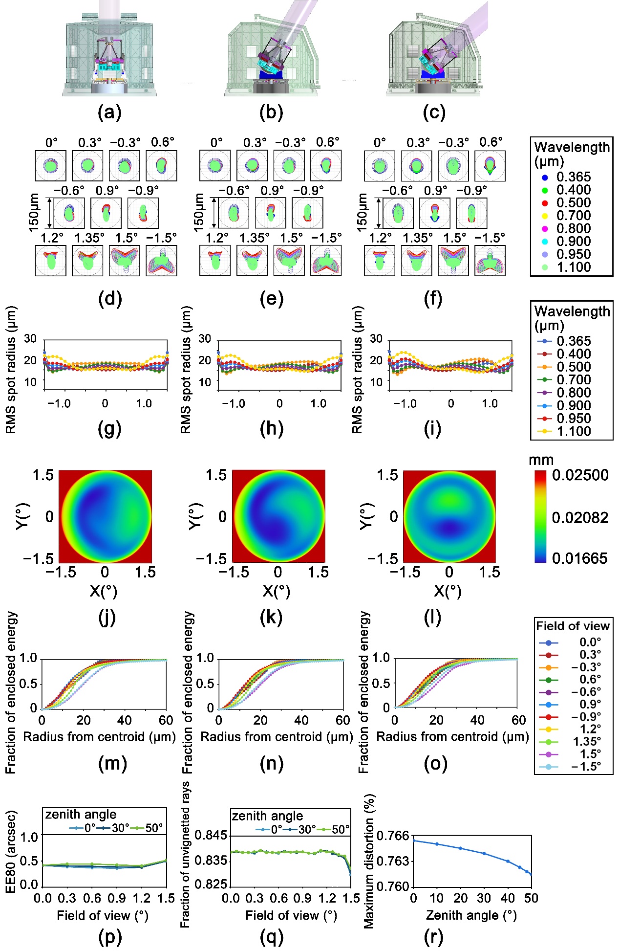 图3.(a)-(c)MUST朝向0°、30°和50°天顶角方向。(d)-(f)不同天顶角下3°视场范围内的光斑图案。图中参考圆的尺寸为150μm(相当于1.3角秒)。(g)-(i)在不同天顶角下各视场光斑的RMS半径。(j)-(l)在不同天顶角下整个3°视场中的RMS光斑半径分布。(m)-(o)在不同天顶角下环绕能量曲线。(p)不同天顶角下80%环绕能量直径随视场变化曲线。(q)不同天顶角下未渐晕光线比随视场变化曲线。(r)不同天顶角下的最大畸变