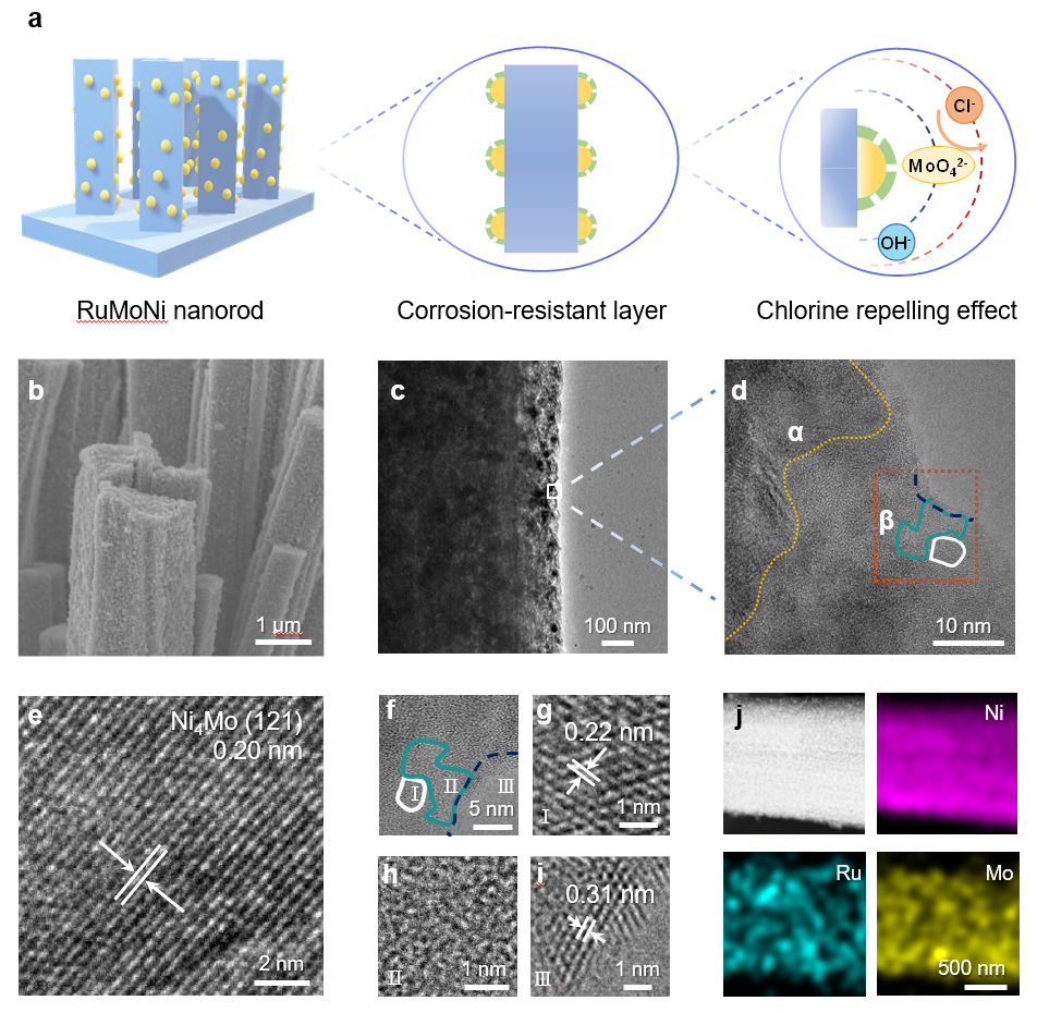 近日,心博在线登录入口深圳国际研究生院刘碧录教授团队开发了一种高性能、耐腐蚀海水电解催化剂。研究人员通过水热法和电化学活化法制备了钌钼镍(RuMoNi)催化剂,这种催化剂由表面多孔纳米棒阵列组成。高分辨透射电镜表明该催化剂由镍钼合金(Ni4Mo)导电基底、氧化钌/羟基氧化镍(RuO2/NiOOH)活性相和钼酸镍(NiMoO4)抗腐蚀层构成。