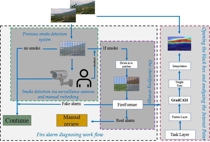基于此,研究团队提出了一种基于自注意力机制的林火监测优化算法,构建烟雾及其周围自然环境要素间的空间特征关系,综合烟雾特征和自然环境要素信息,对烟雾风险类型进行区分,解决了以往方法火警误报率高的问题。同时,团队提出了一套相应的可解释性算法,对模型兴趣区域进行可视化研究,增强了深度学习烟雾识别模型的可解释性。模型的实际应用显著提升了森林火灾监测预警系统的稳定性和可靠性。