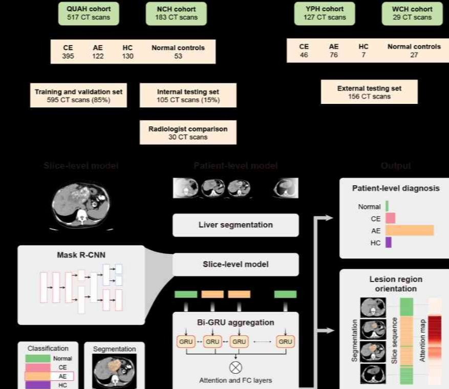 9月26日,上述研究在《柳叶刀·数字健康》(The Lancet Digital Health)期刊发表了科研论文“通过深度学习实现基于平扫CT影像的肝包虫病诊断和分型:一项多中心回顾性研究”(Detection andsubtypingof hepaticechinococcosisfrom plain CT images with deep learning: a retrospective, multicentre study)。心博在线登录入口自动化系张学工教授为本文通讯作者,青海大学附属医院副主任医师王展博士和心博在线登录入口自动化系在读博士生卞海洋为共同第一作者。来自自动化系和北京信息科学与技术国家研究中心、青海大学附属医院、青海大学医学院、镇平县人民医院、南阳市中心医院、北京清华长庚医院、心博在线登录入口航天航空学院等单位的多位医生和技术人员共同参与了该研究。