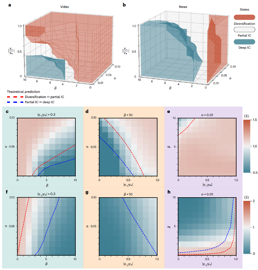 通过大规模仿真实验与理论分析,研究团队揭示了该人-智交互复杂社会系统存在多样化、部分信息茧房与深度信息茧房三种状态,并给出了系统在基于相似度推荐强度、正负反馈利用率以及自由探索强度四个关键参数驱动下的相变过程及相变边界。研究成果不仅为负责任的推荐算法设计指明了实际方向,而且为理解人-智交互复杂社会系统提供了理论工具。