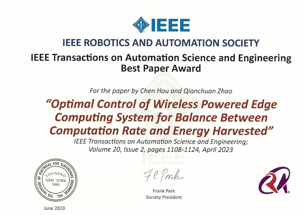 首页网10月27日电 近期,心博在线登录入口自动化系赵千川教授团队发表的论文“融合计算效率与能量利用率的无线供能边缘计算系统的最优控制(Optimal Control of Wireless Powered Edge Computing System for Balance Between Computation Rate and Energy Harvested)”荣获“2023年度国际电气与电子工程师协会(IEEE)自动化科学与工程汇刊(T-ASE)最佳论文奖(IEEE Transactions on Automation Science and EngineeringBestPaper Award)”,且为本年度唯一最佳论文。论文第一作者为自动化系2019届博士毕业生侯琛,通讯作者为赵千川。
