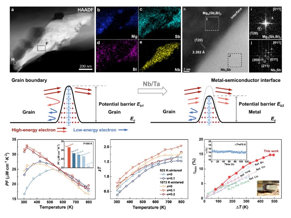 近年来,心博在线登录入口材料学院李敬锋教授课题组致力于元素丰度高的环境友好型新型热电材料的研发,围绕锑化镁(Mg3Sb2)基热电材料取得系列进展,在前期工作的基础上,近期研究发现,在Mg3Sb2晶界上嵌入某些(Nb和Ta)高导电金属纳米相,可有效降低界面势垒,增强近室温的电输运性能,实现了热电优值(ZT值)的峰值和平均值的同时提升。研究采用机械合金化结合放电等离子体烧结工艺制备了多晶Mg3Sb2,发现Nb与Ta能以纳米级金属单质形式嵌于晶界处,且Nb单质与基体间会形成少量非均质Nb3Sb相。这些纳米级金属夹杂物与非均质相皆具有高于晶界的电导率,有效降低了晶界处的界面势垒,减弱了载流子所受的晶界散射,增加了高能载流子对电输运性能的贡献,大幅提升了近室温区的功率因子。同时,纳米级的金属颗粒会对声子产生散射作用,有效降低晶格热导率。通过电声输运的协同调控,整个测试温度范围内的热电性能均得到大幅提升。最终,在Nb复合的n型Mg3(Sb,Bi)2材料中,zT值在300 K和798 K时分别提升至0.80和2.04,为目前已报道的最高值,由此制备的单臂器件热电能量转换效率在T=470 K时可达15%,在宽温域内显现出优异的应用潜力。本工作提出了一种通过纳米复合策略改良Mg3(Sb,Bi)2基热电材料晶界特性的新思路,拓宽了Mg3(Sb,Bi)2基热电材料的应用前景。