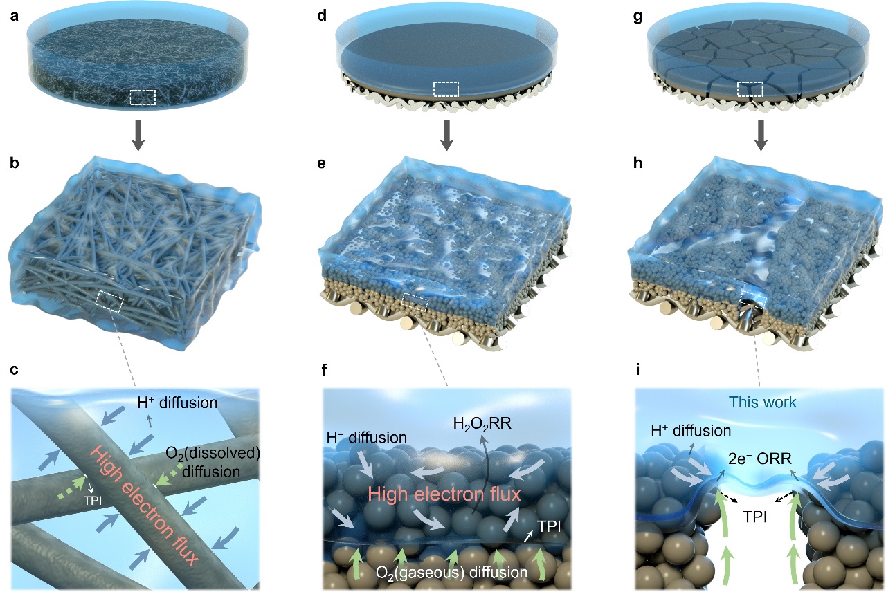 首页网12月4日电 过氧化氢(H2O2)是现代化学工业的基石之一,同时也是潜在的能源载体,具有广泛的应用范围,例如增值化工产品合成以及清洁水生产等。电化学双电子氧还原反应(2e−ORR)代表了一种经济且可持续的分布式按需生产H2O2的未来战略,适用于从大规模化学品生产到小型便携式卫生设施的潜在应用。气体扩散电极(GDE)被公认为是目前最有前途的2e−ORR电极架构平台,其允许气态反应物直接从供给端输送至反应性气-液-固三相界面(TPI)而无需预先溶解到电解质中。然而,由于高电流密度操作条件下的快速电润湿对气体扩散电极反应性三相界面造成的破坏性淹没,使得H2O2电合成工艺的工业转化面临选择性低和耐久性差的重大挑战。
