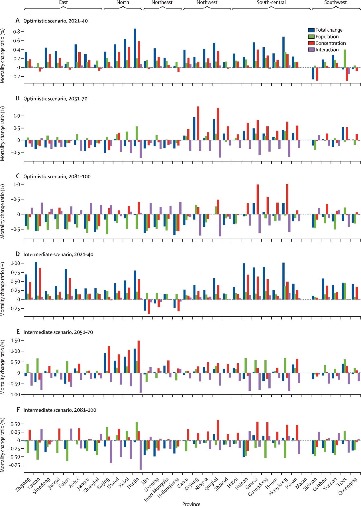 图2.中国各省份可归因于野火PM2.5排放的年度全因死亡预测变化的时空格局