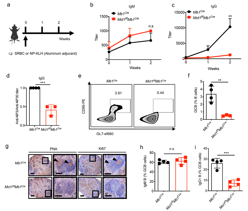 生物体持续受到外界环境的刺激,为了应对这些刺激而产生的免疫反应需要消耗机体大量的能量。生发中心(Germinal Center,GC)是一个在周围淋巴器官中形成的动态结构,它为B细胞的高频突变和抗体类别转换提供了一个独特的微环境。生发中心的正常形成对于高质量IgG型抗体的产生至关重要。B细胞在受到免疫刺激激活后,会经历一个广泛的代谢重塑过程。乳酸既是糖酵解的产物,又可以作为能源为细胞提供能量,而在大部分细胞中乳酸主要是通过MCT1进行运输。研究人员以乳酸转运蛋白MCT1为主要研究对象,从代谢角度深入解析代谢在抗体产生过程中的作用和潜在机制,为疫苗研制和自身免疫疾病的治疗提供新的方法和策略。