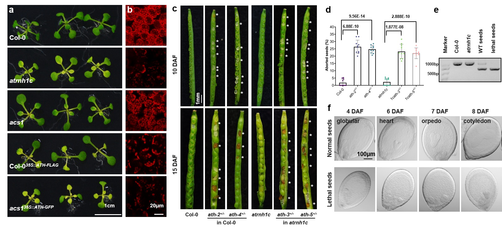 为进一步探究参与基因组稳定性和R-loop调控的新因子,研究人员对atrnh1c突变体进行EMS诱变筛选,获得多个表型抑制突变体。其中acs1(atrnh1c suppressor 1)突变体无论是叶片颜色,光合效率,以及叶绿体的数目和形态,与atrnh1c相比均有显著恢复(图1a和b)。通过基因定位和功能验证鉴定到acs1基因编码一个叶绿体和线粒体双向定位的引物酶ATH(图1c-f)。引物酶在DNA复制过程中合成小的RNA片段,引导合成新的DNA链。