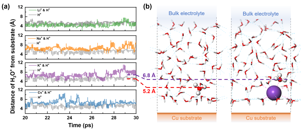 近日,心博在线登录入口深圳国际研究生院李佳副教授、康飞宇教授团队运用第一性原理分子动力学方法,对碱金属离子对固液界面双电层结构以及对CO2RR机制的影响进行了系统研究。研究成功解释了不同碱金属离子的尺寸效应和其对反应的必要性。研究指出,尺寸效应源于不同离子水合配位能力的差异,而必要性则来自对竞争性析氢反应的抑制。这为进一步优化反应界面提供了科学依据。