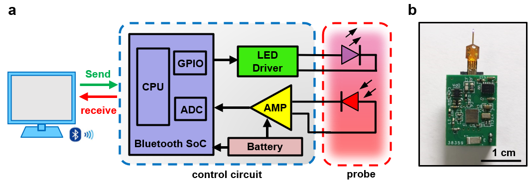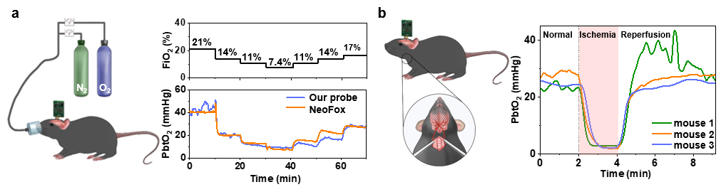 该研究通过设计制备微型薄膜式发光二极管(LED)和光电探测器,结合氧气敏感的磷光涂层,实现高度集成的微型植入式光电探针,利用氧气对铂系金属配合物的磷光猝灭作用实现氧分压检测。此外,研究团队开发了微型柔性电路用于无线能量与信号传输,配合氧分压检测探针,实现全植入式的光电氧分压传感系统。