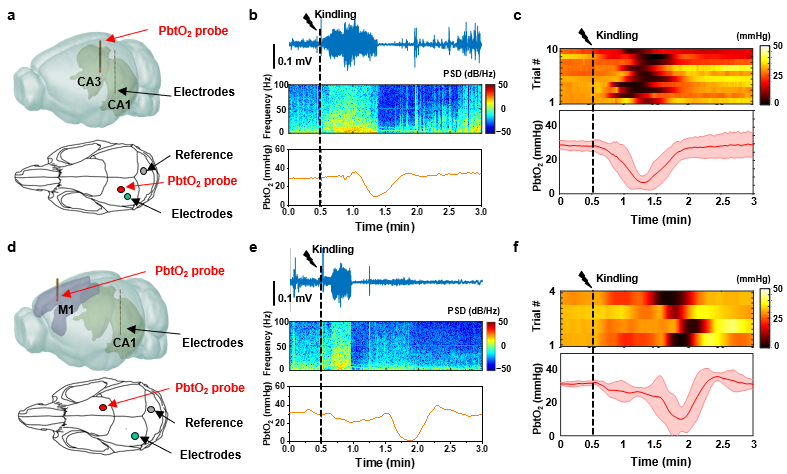 在体外表征测试中,该氧分压检测探针测得的磷光信号光强随氧分压的增加而减小,探针响应时间小于1秒,并且具有高度的氧气选择性。以啮齿类动物(小鼠等)为模型,通过微创方式植入动物脑部,实现对动物深部脑区的氧分压无线动态监测,在改变吸入氧气浓度、颈动脉短时程夹闭、麻醉等情况下探究脑组织氧分压的变化规律。此外,在电刺激小鼠海马脑区诱导癫痫的模型中,测得了癫痫放电之后海马、皮层等不同脑区显著的乏氧状态与氧分压波动;与电生理记录结合,同步监测癫痫过程中的神经电活动与局部组织氧分压变化, 探索了氧气在脑神经异常活动过程中的作用与机理,以及局部神经活动与氧代谢的耦合规律。这种无线、实时、原位、精准的动态脑组织氧分压监测技术,为深入探索氧代谢过程与神经活动以及脑疾病状态的关系提供了有效的工具。