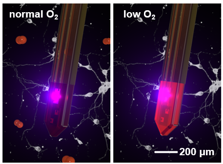 大脑是对氧气最敏感的器官,脑组织中的氧含量直接影响大脑代谢和功能完整性,氧代谢异常也与颅脑创伤、缺血缺氧性脑病、癫痫、肿瘤等引起的神经系统病损密切相关。与近红外光谱、功能磁共振等技术所获得的血氧信息相比,组织氧分压与局部神经活动和代谢过程有着更加密切的联系。如何实时、准确、便捷、原位地监测脑组织氧分压,并解析其与神经活动的相互作用关系,是脑科学基础研究和脑疾病临床诊疗中的关键问题。近日,心博在线登录入口电子工程系盛兴课题组与合作者开发了一种植入式微型光电探针,可在自由活动的动物深层脑组织中实现无线、连续、实时的脑组织氧分压监测。