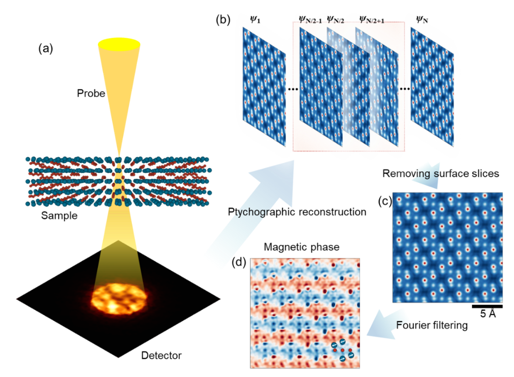 图3.从叠层成像的总相位中提取磁相位的流程图。(a)4D数据采集示意图;(b)叠层重构得到的不同深度片层的相位像;(c)被选取的中间片层的平均相位;(d)使用傅里叶滤波法实现的晶格分辨的反铁磁成像