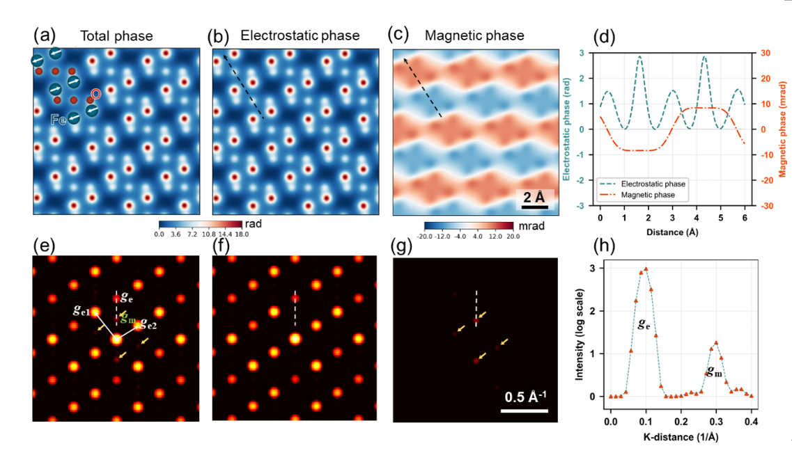 图1.静电势和磁矢势对高能电子波函数的相位贡献。其中(a)-(d)为实空间中相位分布,(e)-(h)为相位分布的傅里叶变换